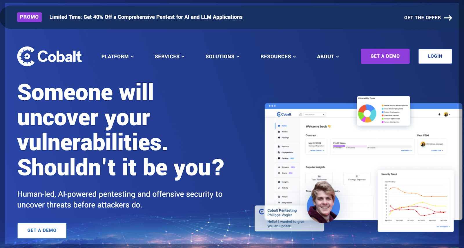 Cobalt is a Pentest-as-a-Service (PTaaS) platform that combines on-demand access to expert penetration testers with a modern SaaS interface. This hybrid approach addresses the limitations of traditional pentesting by offering faster testing, real-time collaboration, and accelerated remediation. It's a way to get the depth of manual pentest without the slow, multi-week reporting delays.