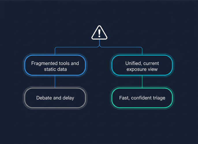 In immature, tool-centric programs, this window fills with confusion about which alert to trust and which system holds the source of truth. Teams spend time pulling context from multiple consoles. Static diagrams and outdated inventories become proxies for reality. Containment decisions drift while people argue about data instead of exposure.